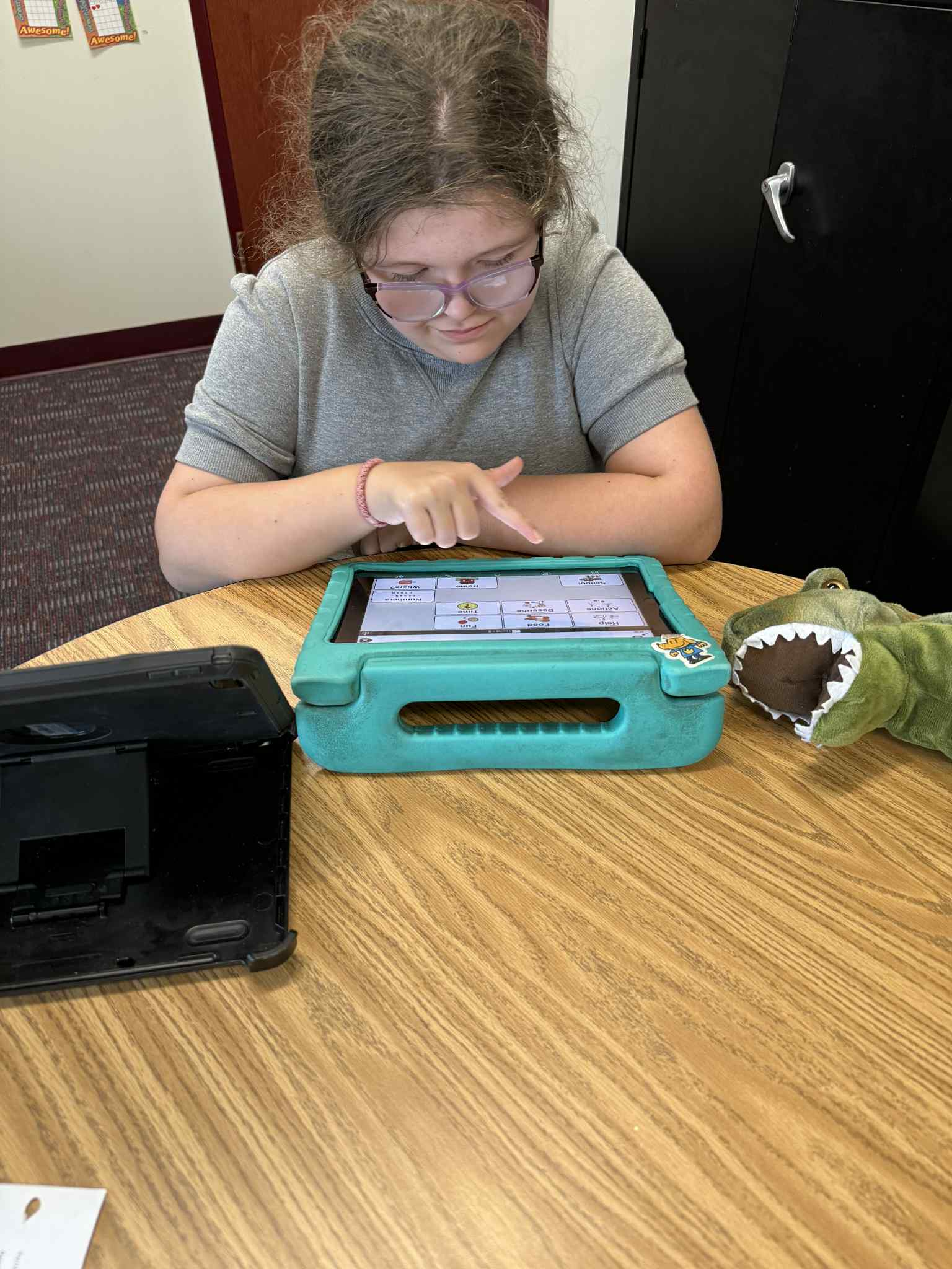 Kenley uses her iPad throughout the school day to support her communication and learning. At the start of each school day, she uses her iPad to get organized and participate in the daily catch up and planning time with her teacher and her classmates. She also uses her iPad at lunchtime to pick what she wants to eat. While some of her classmates use Chromebooks for certain curriculum, Kenley uses her iPad, since she has found that the keyboard on it is more accessible for her. She also uses her text-to-speech program to answer questions during group discussions. Her iPad empowers her to actively participate in class, engage in conversations, and build meaningful connections with peers and teachers.